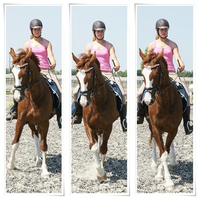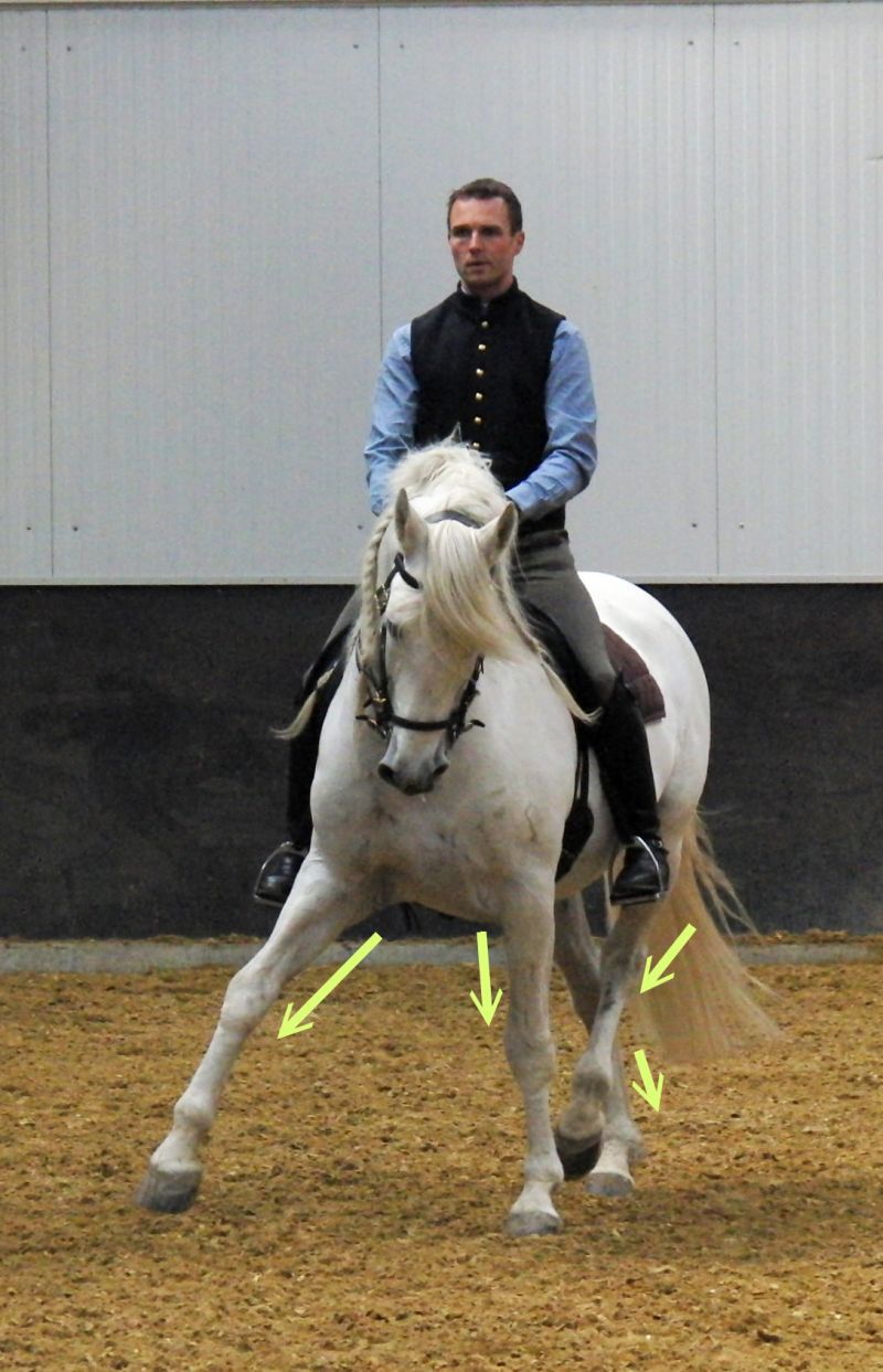 DE tegenoverliggende kuit blijft verder naar voren, vangt de zijwaartse beweging op en voorkomt zo dat de achterhand te ver omdraait, want bij alle zijwaartse bewegingen moet de voorwaartse impuls altijd duidelijker zijn dan de zijwaartse.