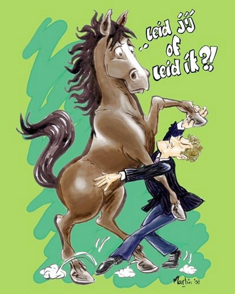 zijn voet moet optillen. Begin met de linkervoorvoet. Dit omdat het paard altijd vanaf de linkerkant benaderd moet worden, je doet eigenlijk vanaf de linkerkant, je tuigt op aan de linker kant, je loopt aan de linker kant, je stijgt ook via de linkerkant op.