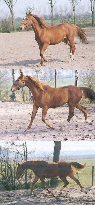 1 : Let op de houding van het paard; hier wordt het hoofd te hoog gedragen. De rug wordt weggedrukt en de achterbenen worden achter het paard opgetild. Er is teveel spanning.